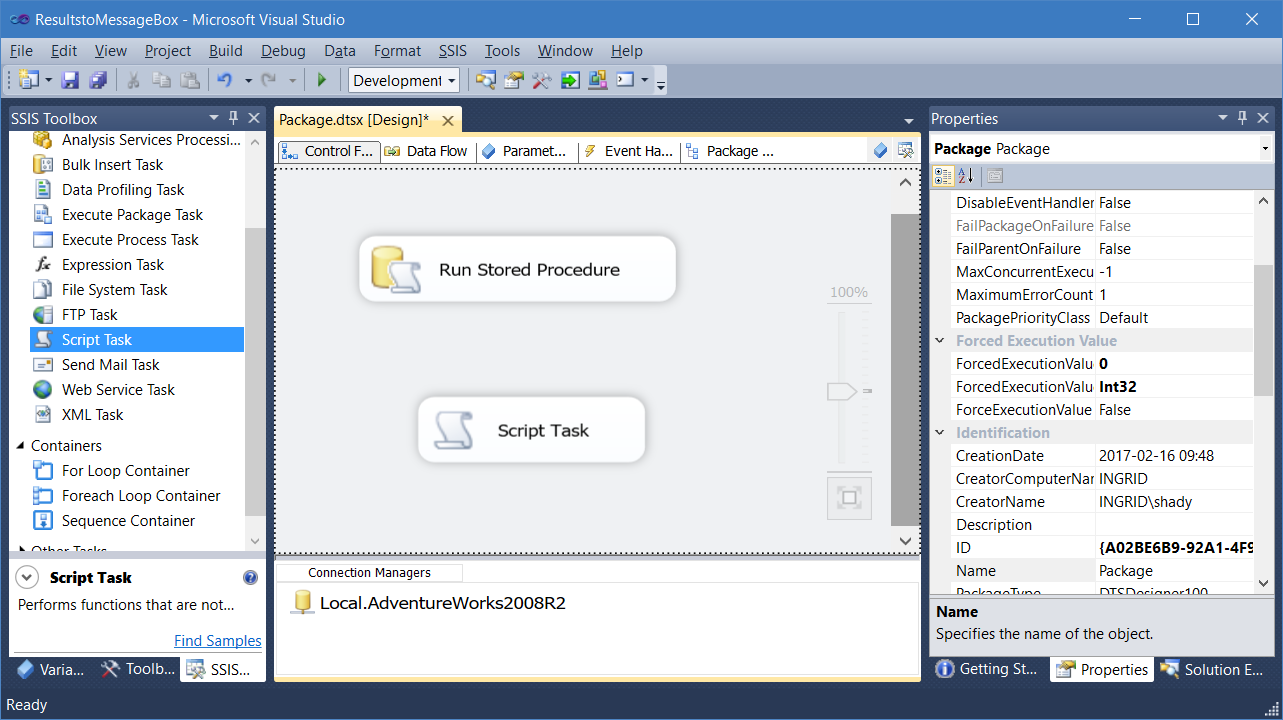 Next, we will utilize a Script Task to display the results. Drag a Script Task from the SSIS toolbox to the package body.